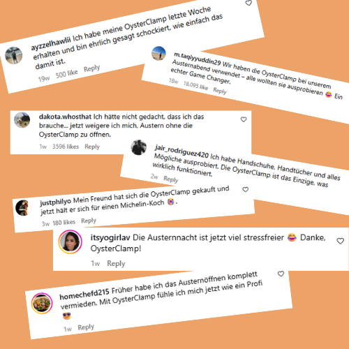 Ich bin beeindruckt von der Langlebigkeit der OysterClamp. Sie ist auf Langlebigkeit ausgelegt und hat das Öffnen meiner Austern viel sicherer und effizienter gemacht. Ich kann auch das hochwertige Austernmesser und den Edelstahlhandschuh wärmstens empfehlen!